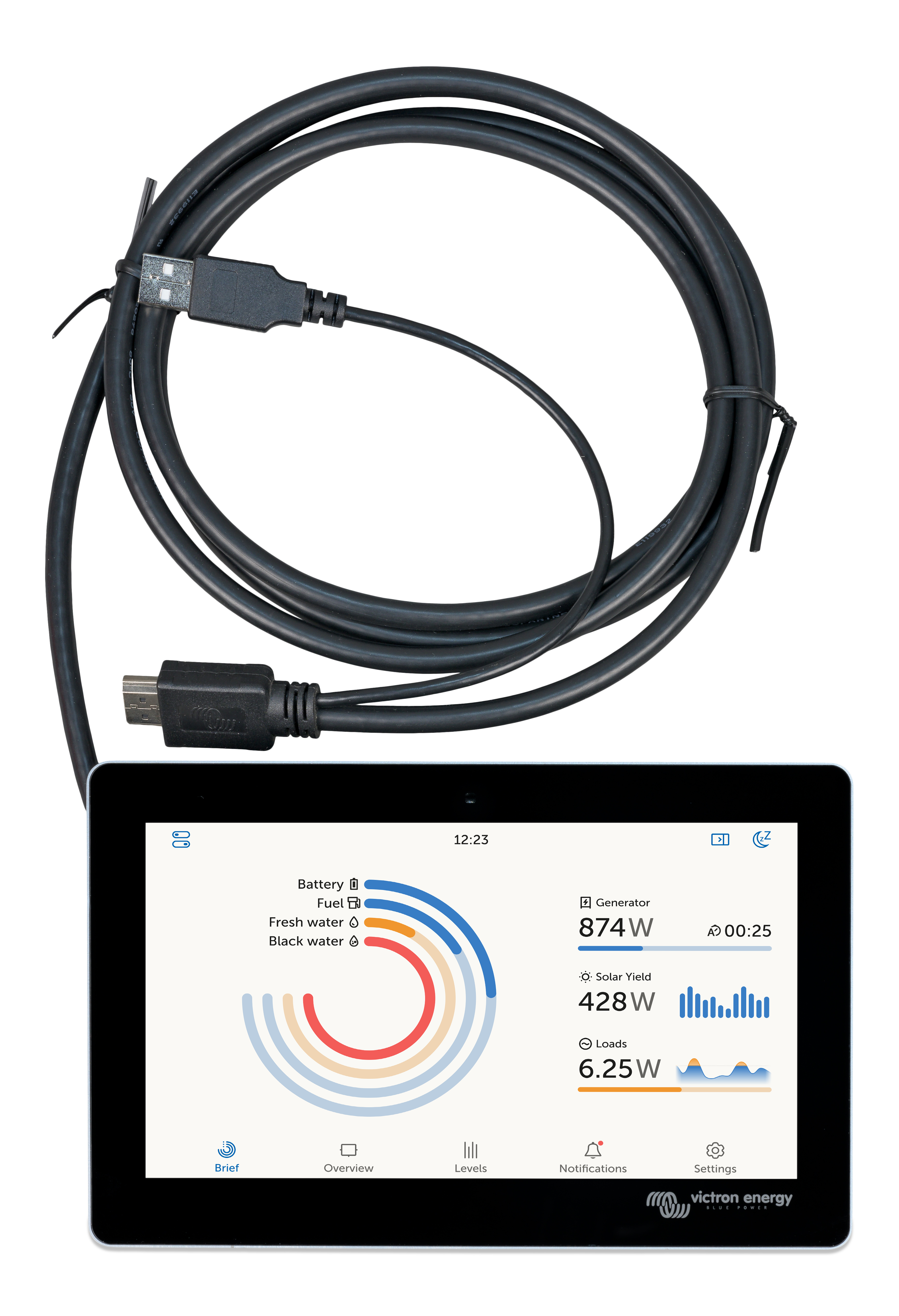 Das GX Touch 50 ist das Anzeige-Zubehör für unser Cerbo GX. Das 5-Zoll-Touchscreen-Display bietet einen sofortigen Überblick über Ihr System und erlaubt es, Einstellungen im Handumdrehen vorzunehmen. Es wird einfach mit einem Kabel an Cerbo GX angeschlossen, sein superschlankes, wasserdichtes Design, die Anbringung von oben, und einfache Installation bieten viel Flexibilität bei der Erstellung eines klaren und sauberen Armaturenbretts.